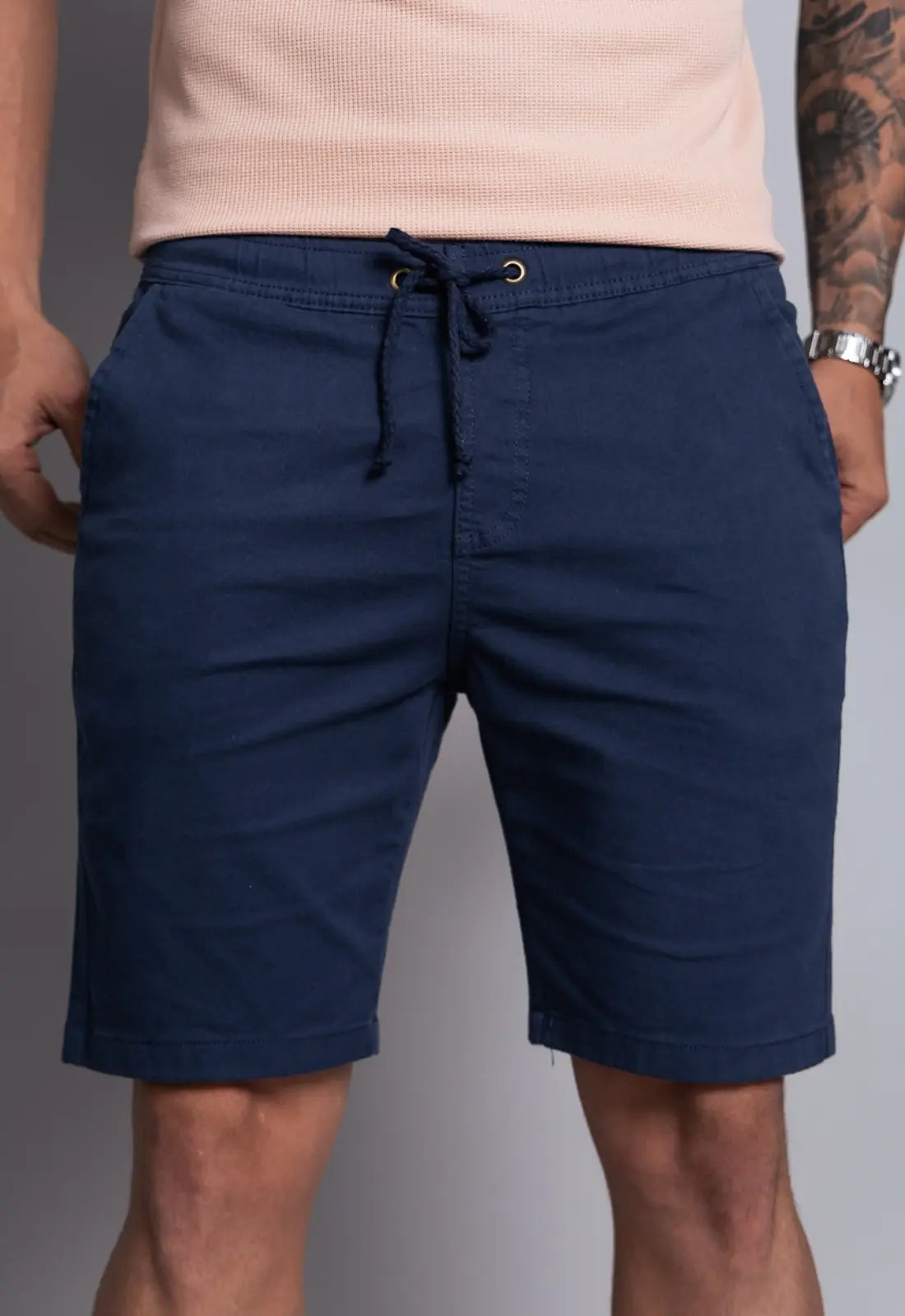 Com um visual moderno e versátil, a Bermuda de Sarja Masculina Azul Marinho com elastano é a escolha perfeita para quem busca estilo e conforto. Sua modelagem slim ajusta-se ao corpo de forma elegante, valorizando a silhueta e proporcionando liberdade de movimento, graças ao toque de elastano na composição.