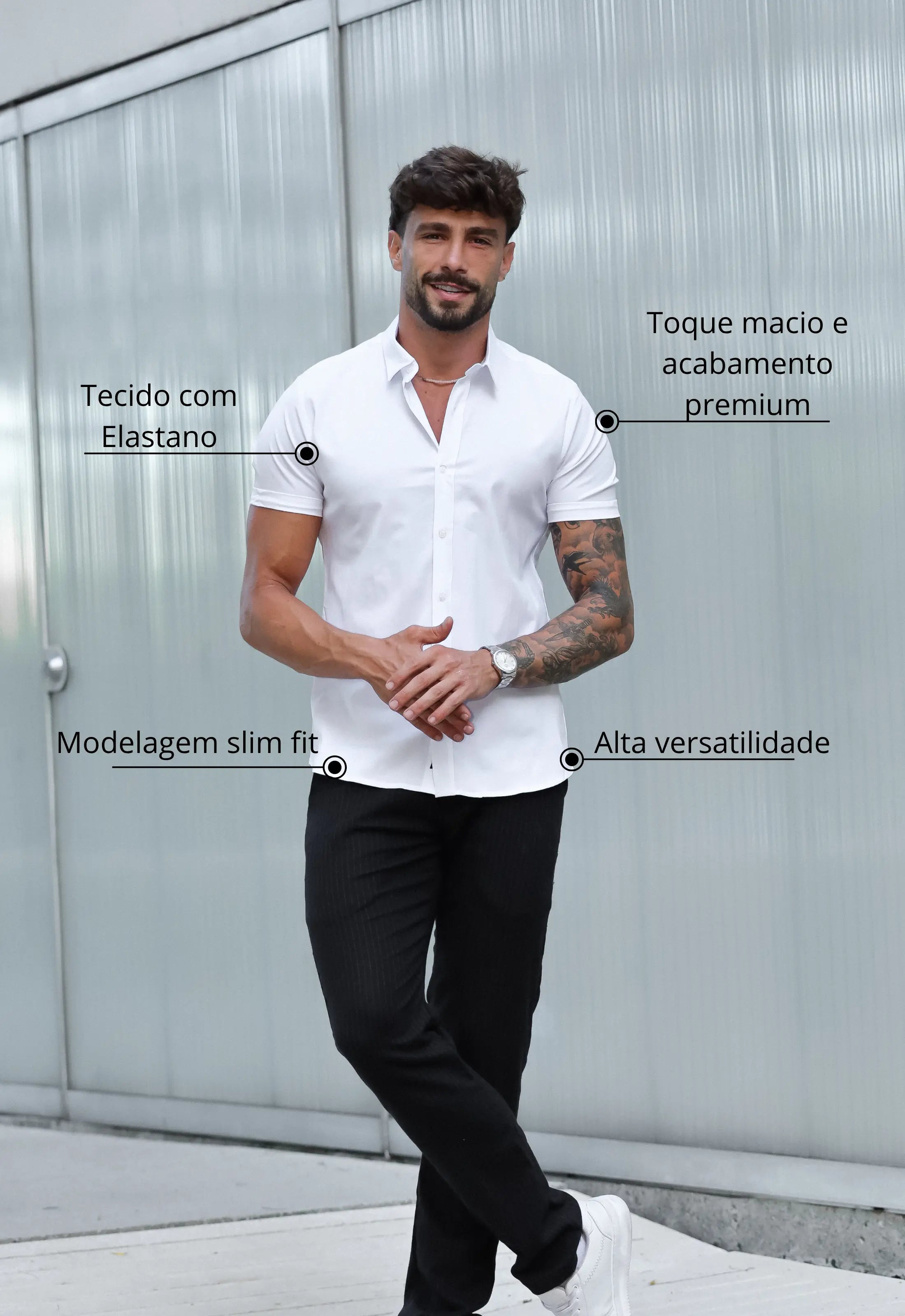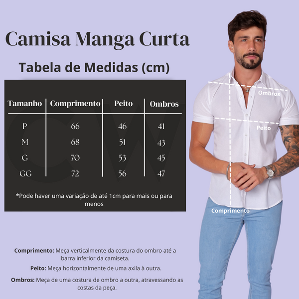 Essa camisa se adapta facilmente a diferentes estilos, assim você pode criar várias composições. Para um visual mais casual, você pode combiná-la com jeans e sneakers; mas, se preferir algo mais formal, uma calça de chino e sapatos sociais são uma excelente escolha. Além disso, você pode usar acessórios como um relógio ou uma pulseira para adicionar um toque pessoal ao look. Isso demonstra como a Camisa Masculina Manga Curta Slim Branca é versátil e indispensável na coleção de qualquer homem.
