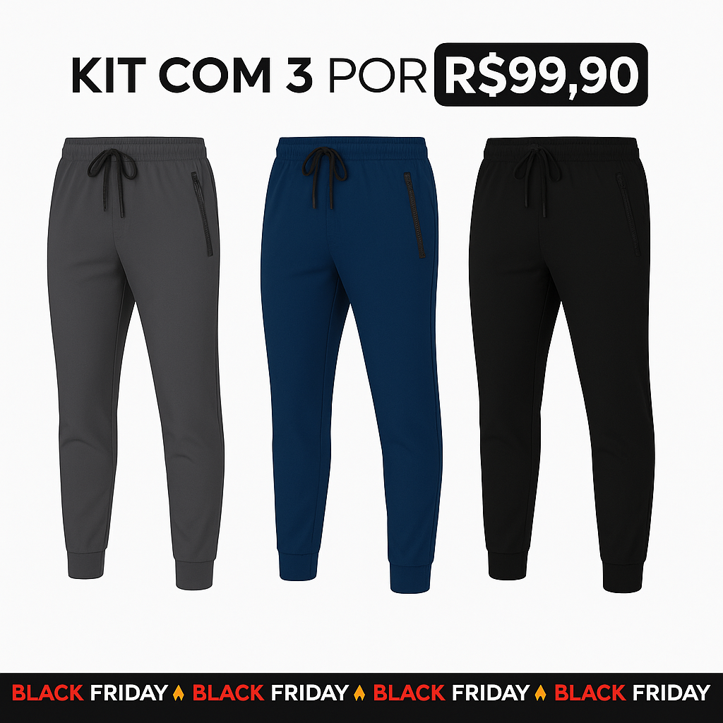 Kit 3 Calças Jogger Evolut Run Alta Elasticidade Secagem Rápida Bolso Com Zíper